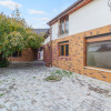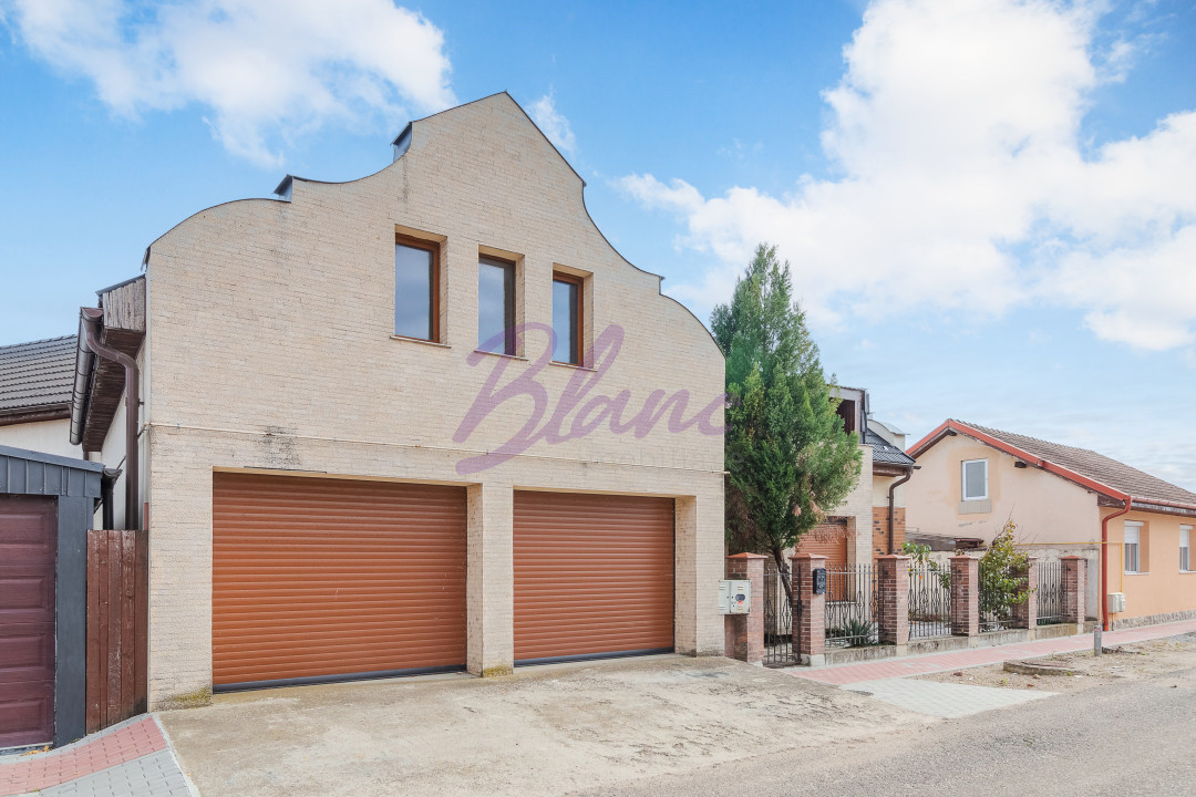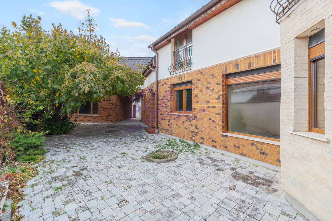 La nivelul solului, proprietatea beneficiază de o curte complet pavată în fața și lateralul casei, iar în spate de o grădină amenajată, cu pavaj decorativ, pomi fructiferi și arbori ornamentali.