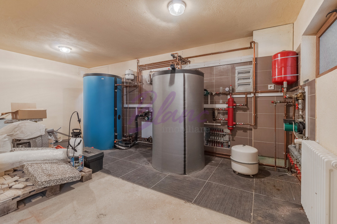 Utilitățile sunt complete: apă, curent, gaz, canalizare prin fosă septică. Ferestrele Velux sunt acționate electric, cu telecomandă, rulourile exterioare sunt electrice, iar instalația solară stochează energia termică în două puffere amplasate în garaj, contribuind la eficiența energetică a casei.